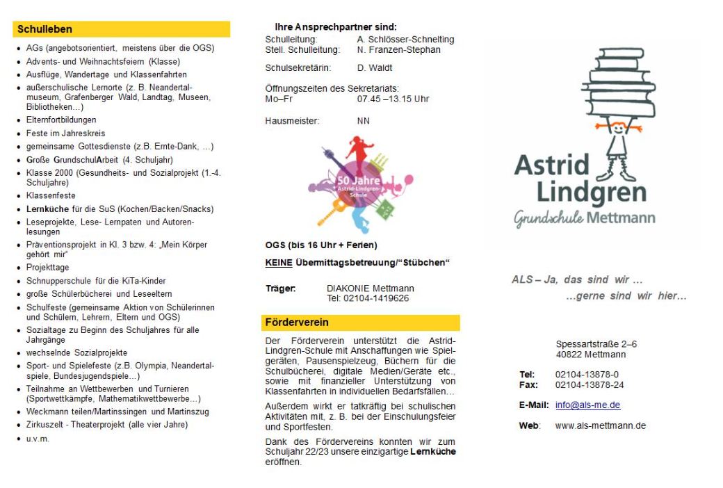 Die Astrid-Lindgren-Schule ist eine vierzügige Grundschule im Mettmanner Stadtteil Metzkausen. Ab dem Schuljahr 24/25 besuchen 408 Kinder unsere zum Teil rhythmisierten Ganztagsklassen und lernen gemeinsam in unserem Schulgebäude an der Spessartstraße. An unserer Schule arbeiten 26 Lehrkräfte. Die OGS liegt in der Trägerschaft der Diakonie Mettmann und befindet sich direkt auf dem Schulgelände. Weitere Informationen zur OGS finden Sie im Menüpunkt "Ganztag". Es wurde beschlossen, dass die Übermittagsbetreuung mit der Garantie auf einen OGS Platz zum Schuljahr 25/26 ausläuft. Neue Verträge werden nicht mehr abgeschlossen.